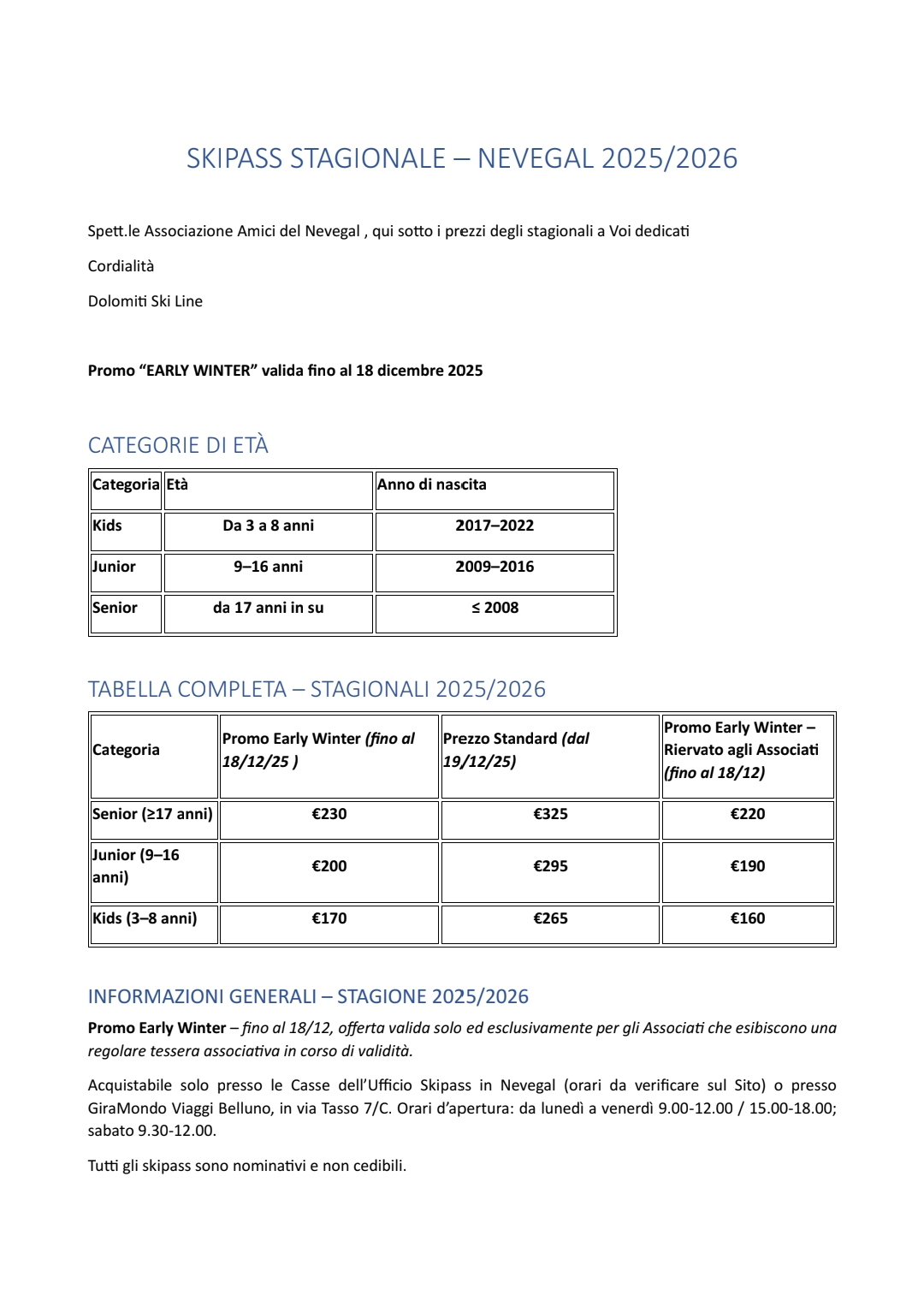 La stagione invernale è iniziata e con l’auspicio che arrivi tanta tanta neve è partita la campagna skipass per il Nevegal. Pur con tutti i problemi che sta incontrando la società Dolomiti Ski Line anche per quest’anno ha previsto uno sconto per i nostri associati .